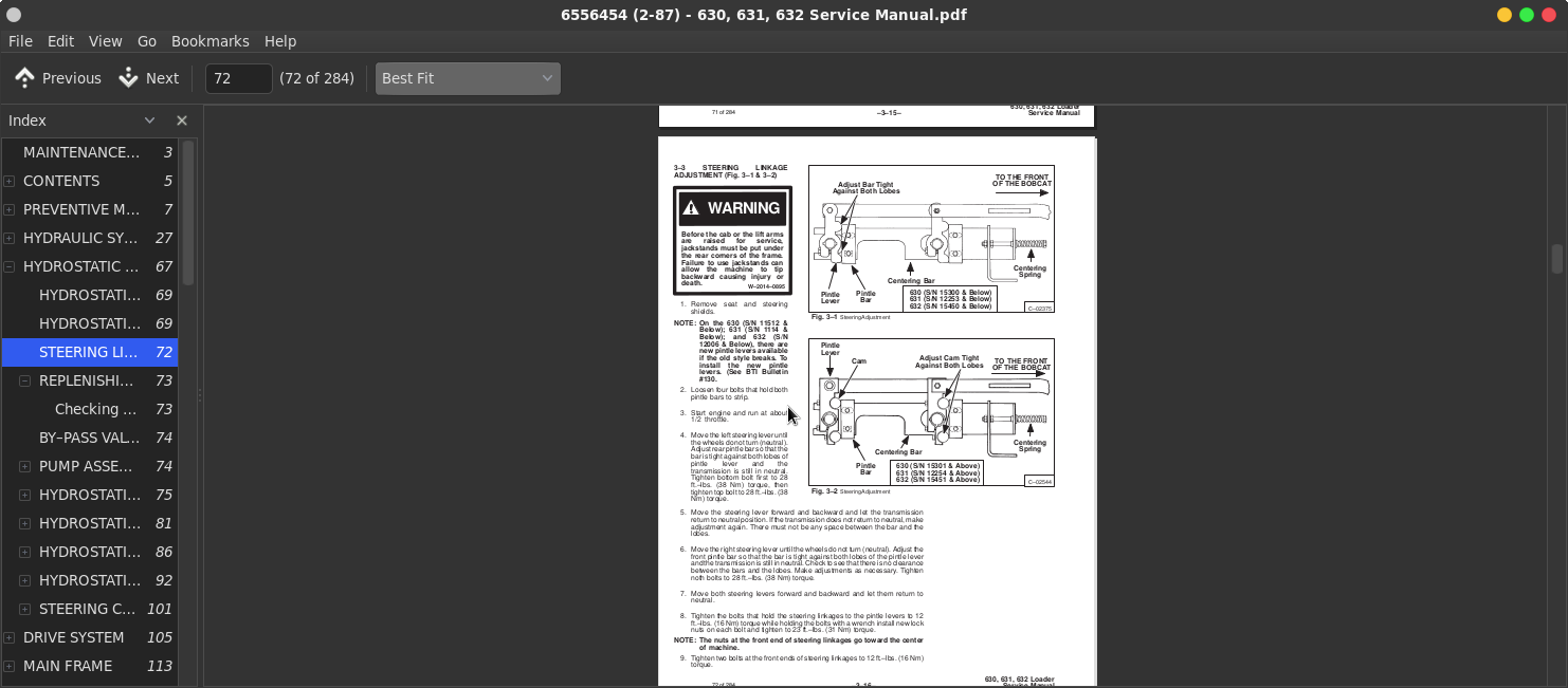 Complete official service manual for Bobcat Skid-Steer Loaders 630, 631, 632, with all the shop information to maintain, diagnostic, repair, refurbish/rebuild like professional mechanics.